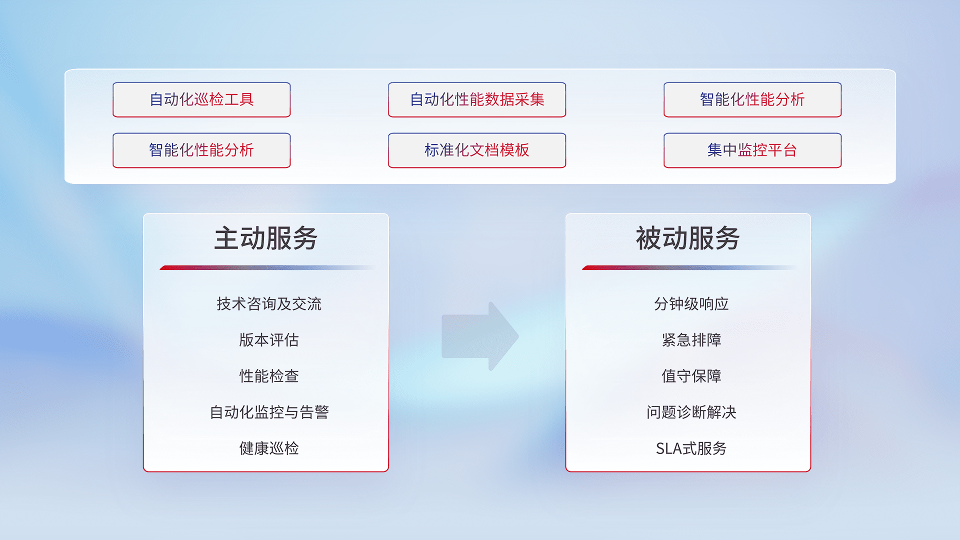 智能化工具和标准化文档,,,,保障服务质量,,提供主动服务(包含技术咨询、、、版本评估、、性能检查、、、、自动化监控与告警、、健康巡检)和被动服务包含(分钟级响应、、、、紧急排障、、值守保障、、、问题诊断解决、、、SLA服务)。。。。